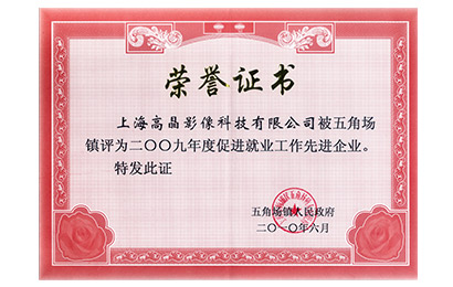 2010年促进就业先进企业荣誉证书-五角场镇